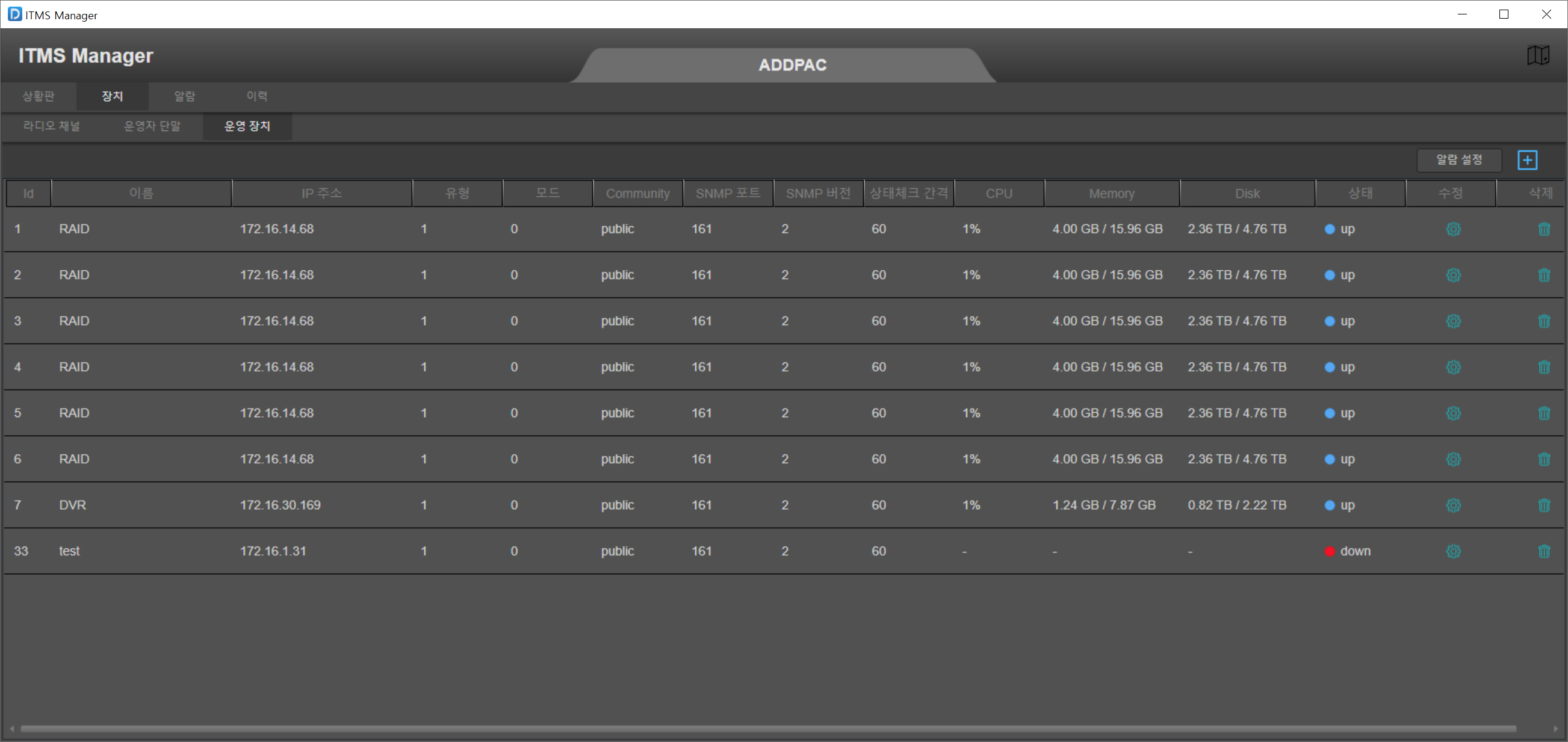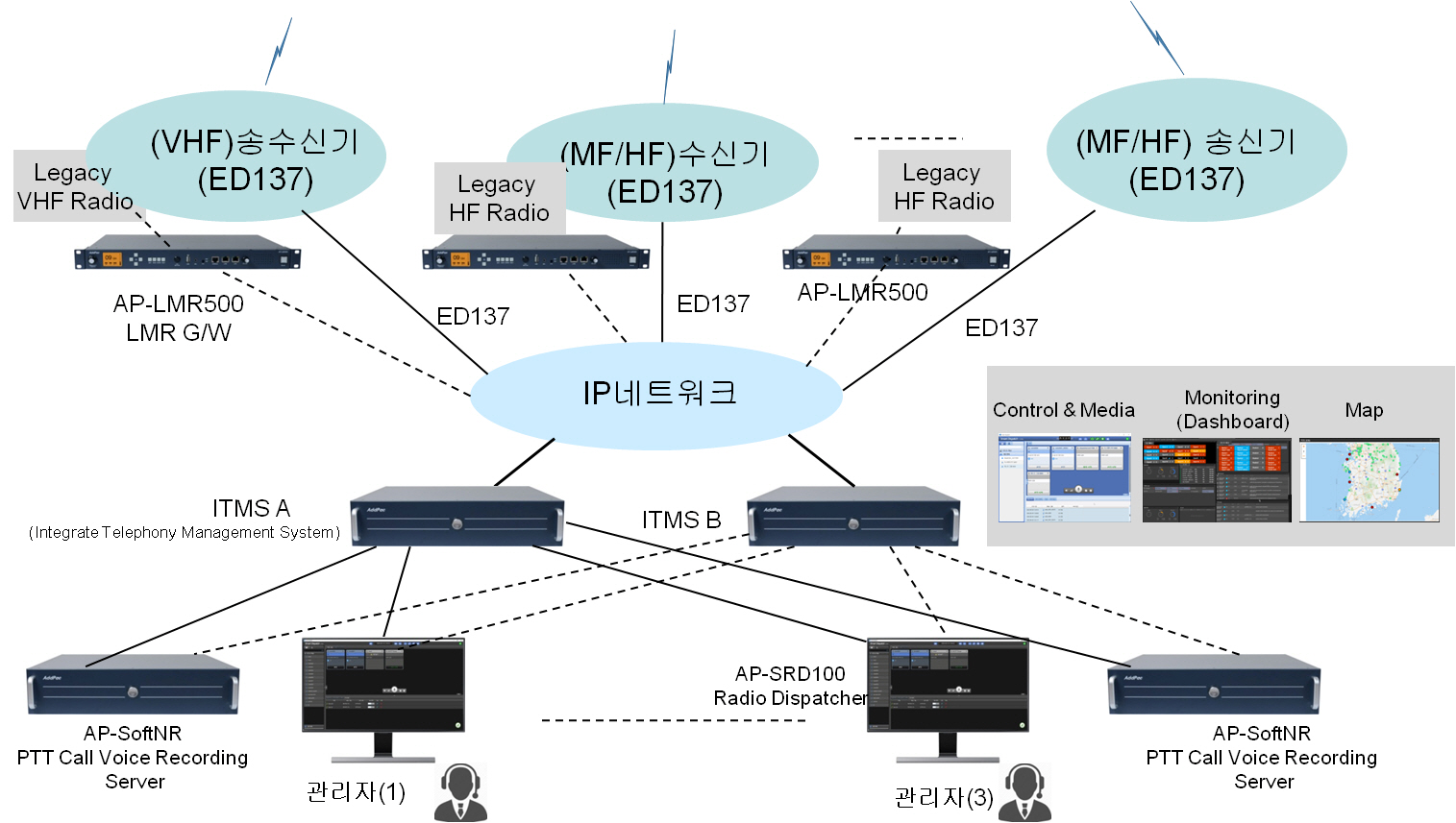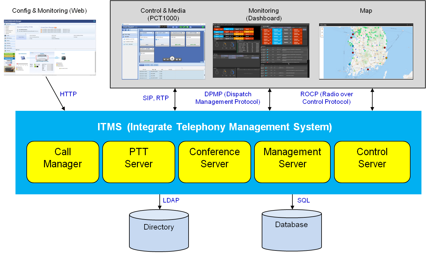 ITMS °ü¸®¼¹ö´Â ¸®´ª½º OS ȯ°æÀ¸·Î ±¸¼ºµÇ¸ç, AP-SoftPBX SIP Äݸ޴ÏÁ® ¼¹ö, AP-SoftPTT Ǫ½ÃÅõÅäÅ© PTT ¼¹ö, AP-SoftMCU ´ÙÀÚ°£ À½¼º¿µ»óȸÀǸ¦ À§ÇÑ ÄÁÆÛ·±½º MCU ¼¹ö, AP-SoftRC ¹«Àü±â¿ø°ÝÁ¦¾î (RC: Radio Control)¼¹ö, AP-SoftRM ¹«Àü±â ¿î¿µ¼¹ö(Radio Managment) µîÀ¸·Î ±¸¼ºµÇ¾ú½À´Ï´Ù.