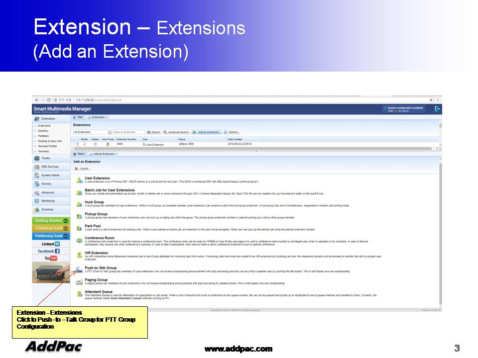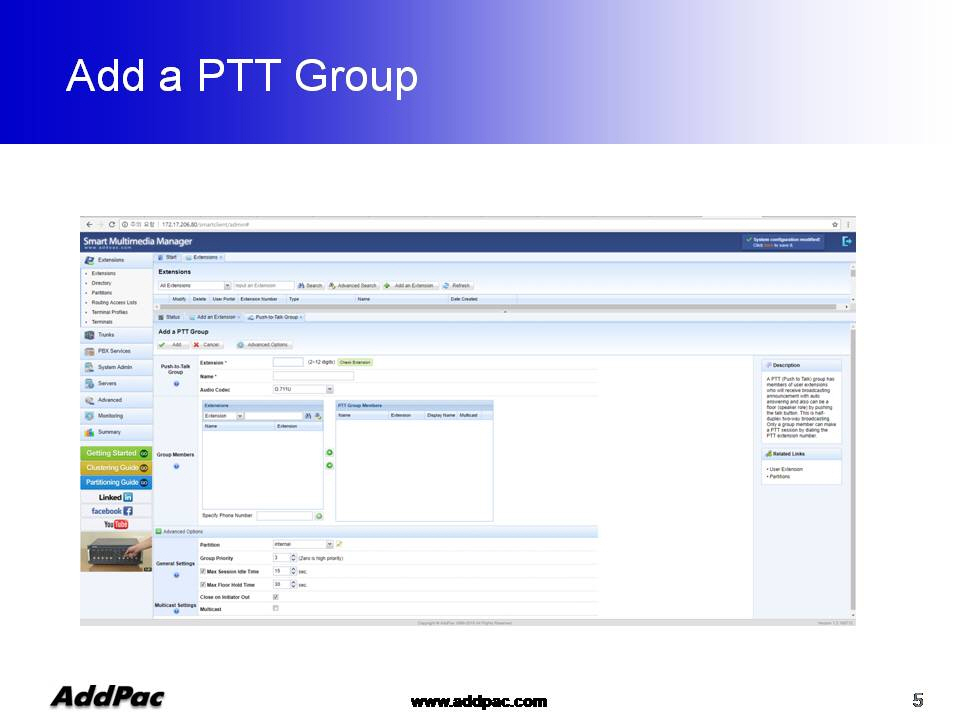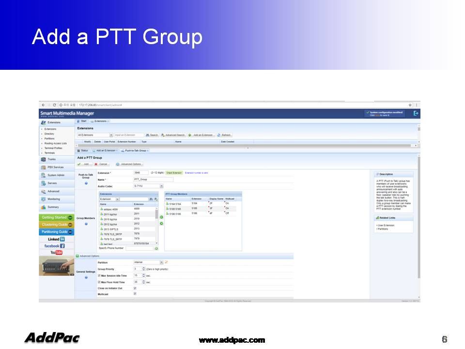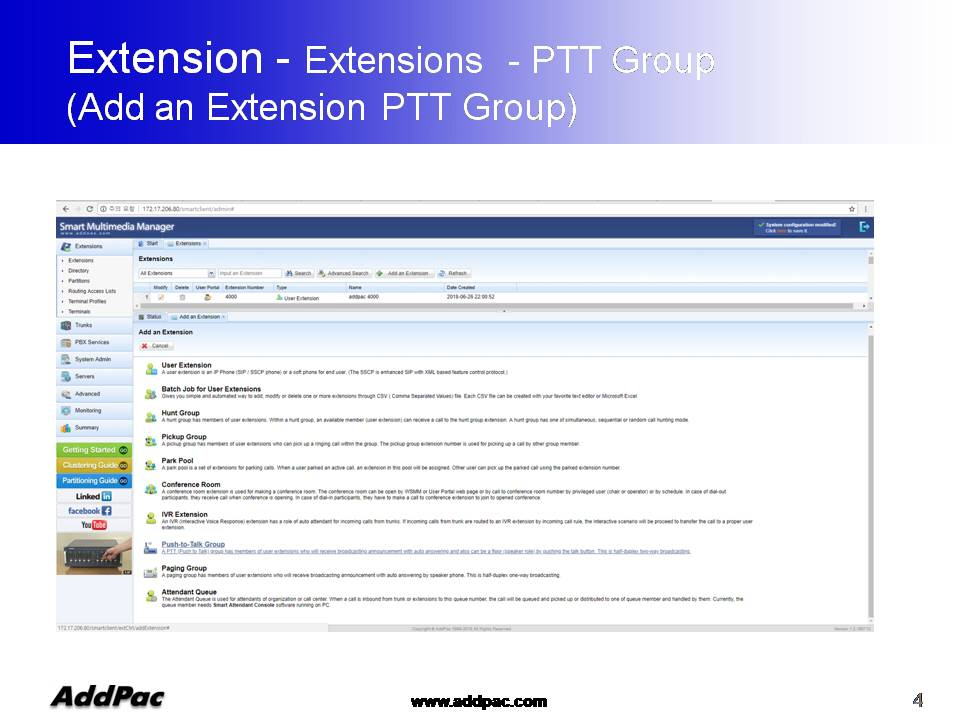 ¾ÖµåÆÅ AP-SoftPTT PTT¼¹ö´Â Æß¿þ¾î ¾÷±×·¹À̵带 Áö¿øÇÏ´Â °í¼º´É ¼¹ö ±â¹ÝÀ¸·Î ¼³°èµÇ¾úÀ¸¸ç, Áß´ëÇü±Þ »ç¾÷Àå¿¡ ÀûÇÕÇÑ Á¦Ç°ÀÌ¸ç ¾ÖµåÆÅÀÇ IP-PBX, LMR °ÔÀÌÆ®¿þÀÌ, IP ÀüÈ±â ¹× ´Ù¾çÇÑ IP Àüȱâ Á¦Ç°µé°ú ¿¬µ¿µÇ¾î Push-to-Talk ±â´ÉÀ» Á¦°øÇÒ ¼ö ÀÖ½À´Ï´Ù.