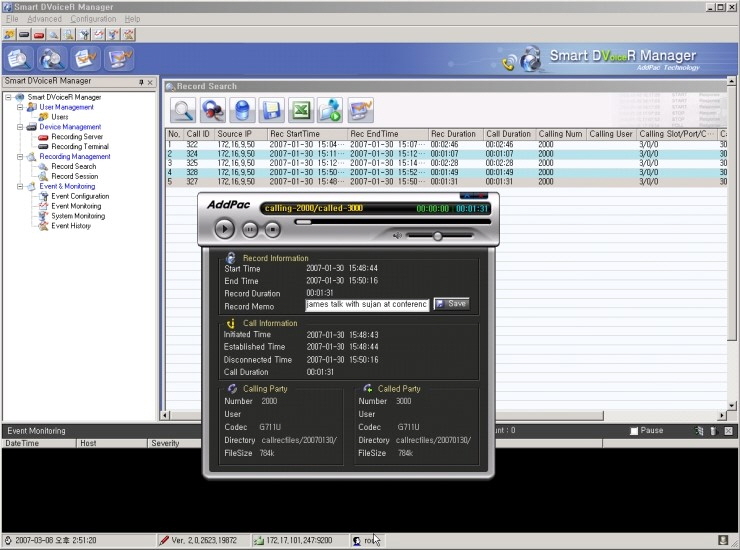 »ç¿ëÀÚ µî·Ï ¹× Á¢±Ù Á¦ÇÑ °ü¸®, À½¼º³ìÃë ÀúÀå¼¹ö »óŰü¸®, ³ìÃëÆÄÀÏ °ü¸®, ³ìÃëÆÄÀÏ ÆÄÇü ºÐ¼®±â´É, Live ÄÝ ¸®½ºÆ® ¹× ¸ð´ÏÅ͸µ ±â´É, À̺¥Æ® °ü¸®±â´É, Recording Board °ü¸®±â´ÉµéÀ» Áö¿øÇÏ´Â ¼ÒÇÁÆ®¿þ¾î ÀÔ´Ï´Ù.