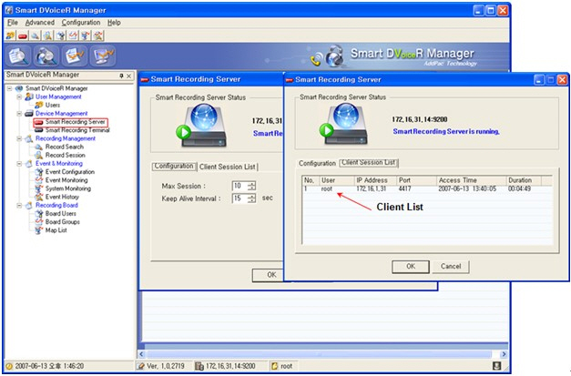 À½¼º ³ìÃë ÀúÀå¼¹ö »óÅ °ü¸® ±â´É¿¡¼´Â ¼³Á¤±â´É°ú Ŭ¶óÀÌ¾ðÆ® Á¢¼Ó ¸®½ºÆ®¸¦ º¸¿©ÁÖ´Â ±â´ÉÀ» Á¦°øÇÕ´Ï´Ù. ¼³Á¤±â´ÉÀº ÃÖ´ë Ŭ¶óÀÌ¾ðÆ® ¼¼¼Ç °³¼ö¸¦ ¼³Á¤Çϰí Keep Alive ½Ã°£À» ¼³Á¤ ÇÒ ¼ö ÀÖ½À´Ï´Ù. Ŭ¶óÀÌ¾ðÆ® ¼¼¼Ç º¸±â¿¡¼´Â ÇöÀç À½¼º³ìÃëÀúÀå¼¹ö¿¡ ¿¬°áµÈ Ŭ¶óÀÌ¾ðÆ® ¼¼¼Ç ¸®½ºÆ®¸¦ º¸¿©ÁÝ´Ï´Ù.