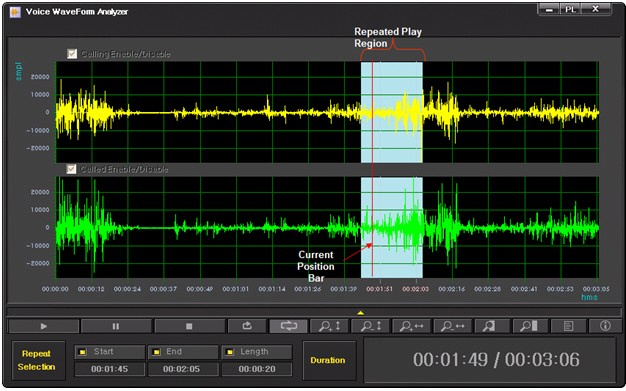À½¼º³ìÃëÆÄÀÏ ÆÄÇü ºÐ¼®±â¿¡¼´Â ¹ß,Âø½ÅÈ£¿¡ ´ëÇÑ À½¼º ÆÄÇüÀ» ±×·¡ÇÈÀ¸·Î º¸¿©ÁÖ´Â ±â´ÉÀ» Á¦°øÇÕ´Ï´Ù. ƯÁ¤ÇÑ È£¿¡ ´ëÇÑ Á¤¹ÐÇÑ ÆÄÇüºÐ¼®ÀÌ ÇÊ¿äÇÑ °æ¿ì¿¡ »ç¿ëµÉ ¼ö ÀÖ½À´Ï´Ù. ±¸°£ ¹Ýº¹Àç»ý ±â´É, Time Domain Zoom In/Out ±â´É, Amplitude domain Zoom In/Out ±â´É, Bookmark ±â´É µî ´Ù¾çÇÑ ±â´ÉÀ» Á¦°øÇÕ´Ï´Ù.