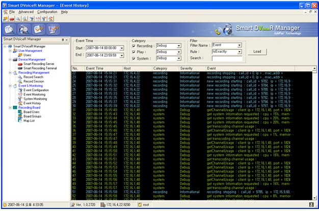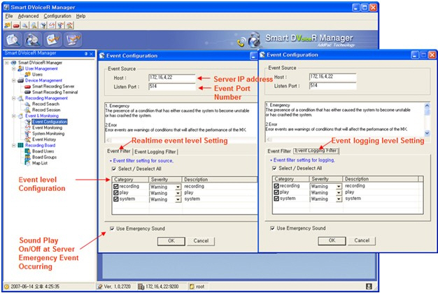 À½¼º³ìÃë ¼¹ö¿¡ ´ëÇÑ À̺¥Æ® À̷°ü¸® ±â´ÉÀ» Áö¿øÇÕ´Ï´Ù. À̺¥Æ® ¼³Á¤±â´É¿¡¼´Â À̺¥Æ®°¡ ¹ß»ýµÇ´Â(event source) ¼¹ö ¾îµå·¹½º ¹× Æ÷Æ® ³Ñ¹ö¸¦ ¼³Á¤µÉ ¼ö ÀÖÀ¸¸ç, À̺¥Æ® ·¹º§ °ú À̺¥Æ® logging ·¹º§À» »ç¿ëÀÚ°¡ ¼³Á¤ÇÒ ¼ö ÀÖµµ·Ï ¼³°èµÇ¾ú½À´Ï´Ù. À̺¥Æ® Ä«Å×°í¸®´Â recording, play, system ¼¼ºÐ¾ß·Î ±¸ºÐµÉ ¼ö ÀÖ½À´Ï´Ù. ºñ»ó °æ°íÀ½ ¹ß»ý¿©ºÎ¿¡ ´ëÇÑ ¼³Á¤ ±â´ÉÀ» Á¦°øÇÕ´Ï´Ù.