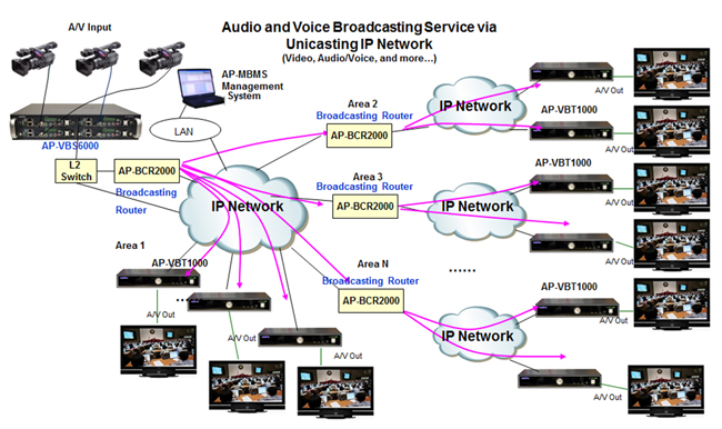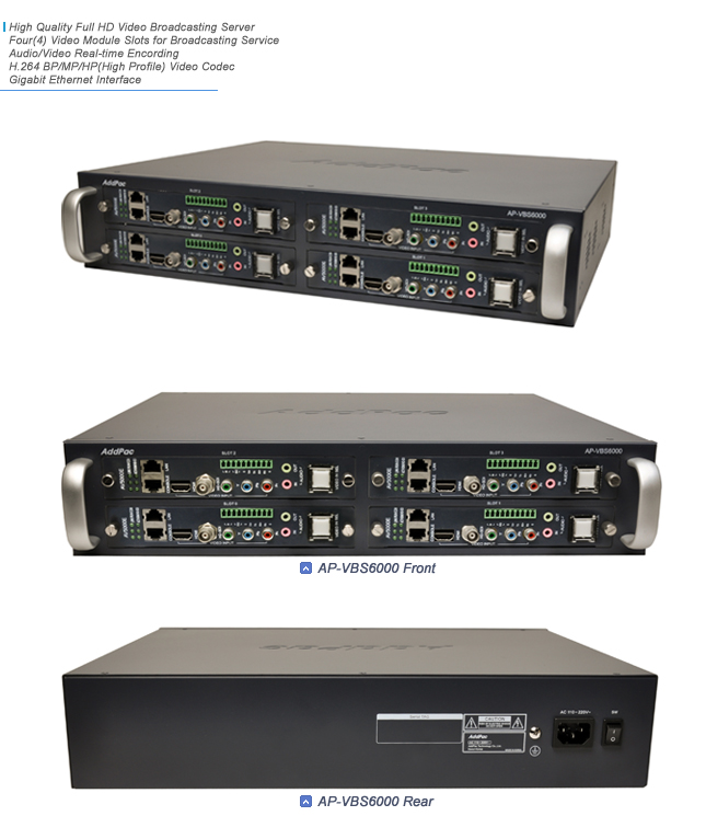 AddPac IP based Full HD video broadcasting solution connected with broadcasting router and HD video broadcasting terminal with the high performance Full HD video broadcasting server as the center to transmit high quality HD broadcasting and voice broadcasting in real time. AP-VBS6000 system is IP based HD video broadcasting server device which is embedded with four HD video broadcasting encoder modules. It also supports a next generation video codec H.264 which provide high quality resolution as well as bandwidth. It is applicable to various IP based real time HD level broadcasting fields such as legislature broadcasting, preach broadcasting, and remote lecture.